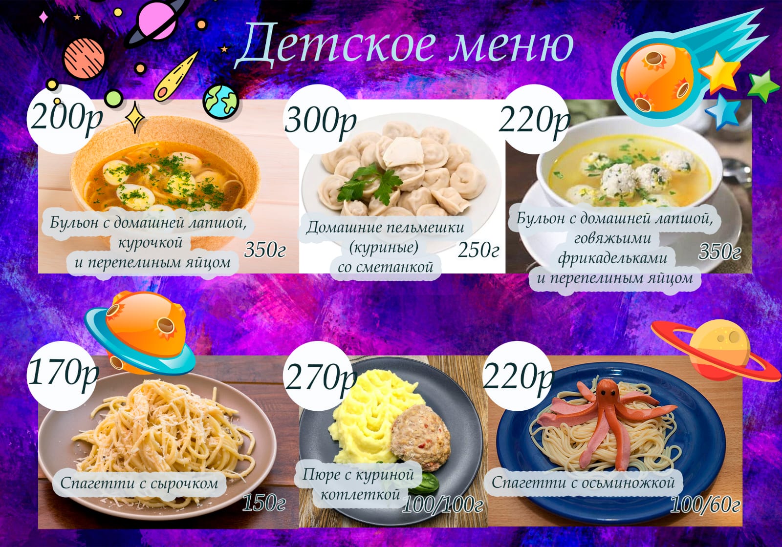 Порадует наших гостей и меню фуд-корта, расположенных на втором этаже экшн-парка. В ассортименте блюд – гамбургеры и чизбургеры с начинками на любой вкус, пицца в ассортименте, блюда традиционного меню, любимые всеми, сладости и десерты, напитки, а также первые блюда.